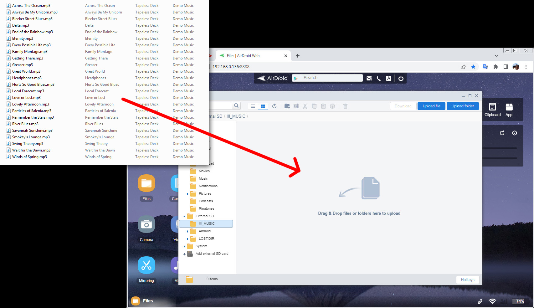 9. Now you can upload music from your computer to the Tapeless Deck memory. Open folder with music files in your computer, select desired files or folders and just drag them to the !!!_MUSIC folder on Tapeless Deck. Wait for the transfer to finish, observing the transfer status window on the lower right corner. That's all - now you may use Tapeless Deck app :)