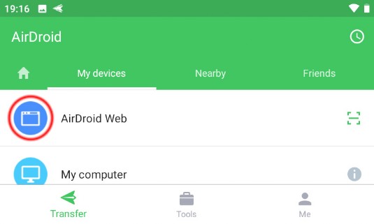 3. Find and click blue "AirDroid Web" icon. It may be covered by ads, so sometimes you will need to scroll the screen to find it...